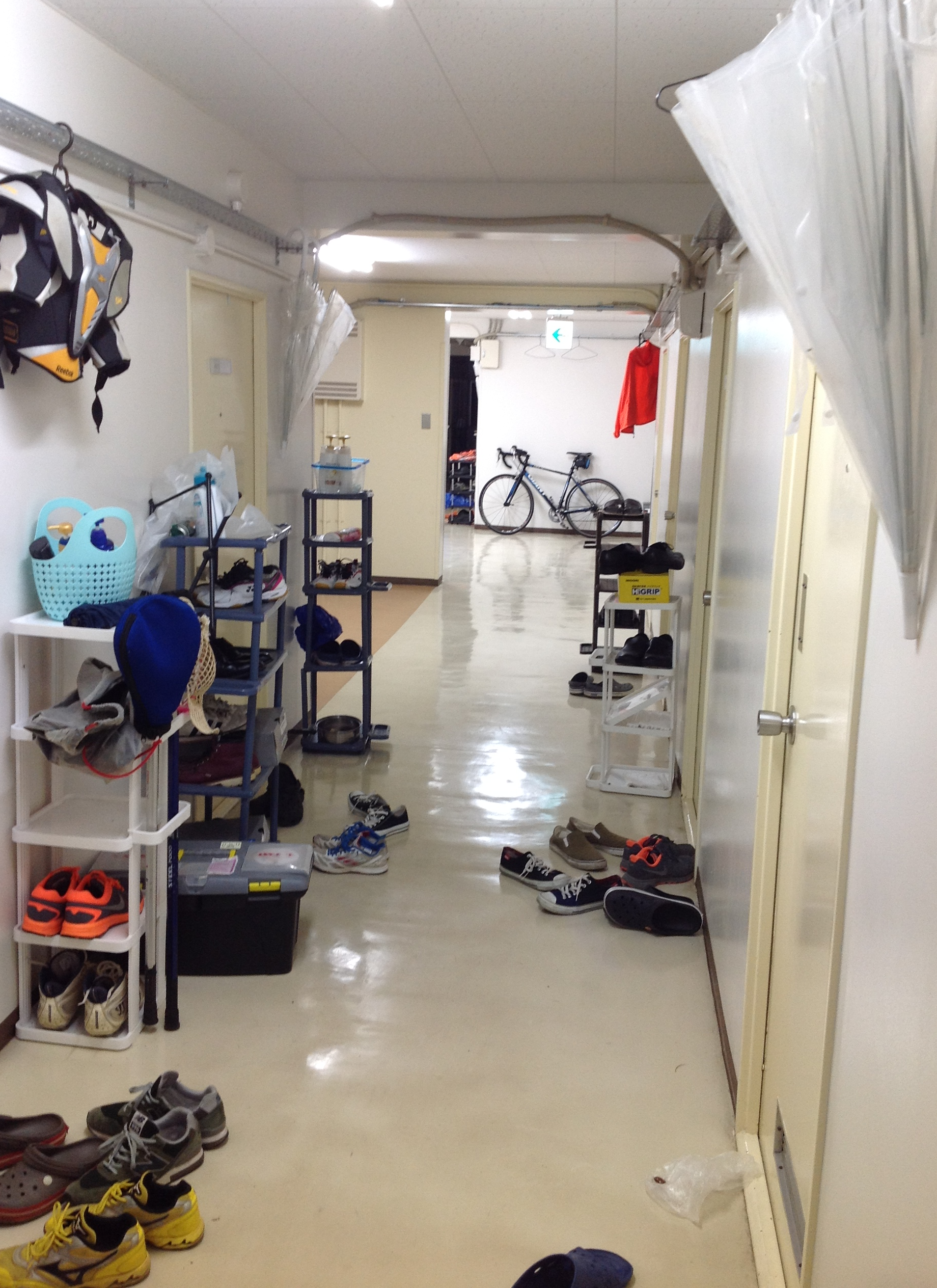 淋浴室也在房間外面,走去洗澡時不免會遇見別人,淋浴室裡偶爾會見到別人遺留下的物品,甚至有人將球衣放在水槽泡水,一泡就是好幾天。這些對我來說都滿不舒服的,但對住慣臺灣宿舍或雅房的人來說,應該也沒有適應困難吧。淋浴室最大的問題還是在於熱水供應的時間,100日圓9分鐘,這是2014年4月消費稅從5%調漲為8%之後的結果(請各位一起為安倍經濟學打拼)。寒冷的天氣裡九分鐘的熱水是不夠的,但投200日圓沖18分鐘的熱水又稍微多了一些。洗完澡後如果還有其他需要溫水來清潔自己的狀況,想想那麻煩的淋浴室,大概只能放棄或忍耐房間裡的冰水了。過去還不是每棟宿舍都有投幣淋浴室,要去共用的大澡堂洗澡(還是要付費)。目前宿舍普設淋浴室,大澡堂的營業規模也縮小,現在一の矢宿舍甚至已經沒有澡堂了。