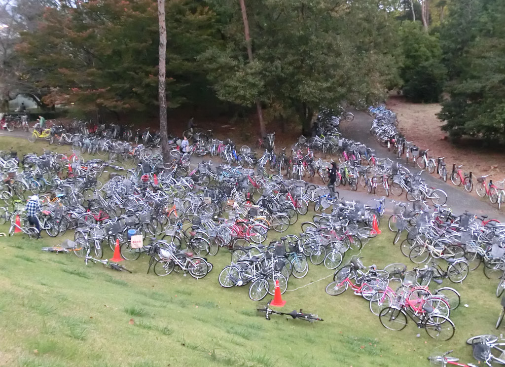 筑波大學佔地廣闊,大多數學生會購買自行車(學生間通稱「チャリ」)作為代步工具,上課時間縱貫筑波大學校區的ペデストリアンデッキ(pedestrian deck,簡稱「ペデ」)上常可見到一陣陣自行車海呼嘯而過。教學研究區在上課時間停滿自行車,起大風時被吹得東倒西歪,校園角落倒著被畢業學長遺棄的生鏽自行車等等,都是筑波大學常見的景象,也可說是亂象。為了整頓自行車的亂象,目前筑波大學已經導入自行車登錄制度,必須向學校登記後才能在校內(包括宿舍)停放,未登記而停放會被放一張警告單。學年結束時,三月間也有回收二手自行車給新生使用的服務。