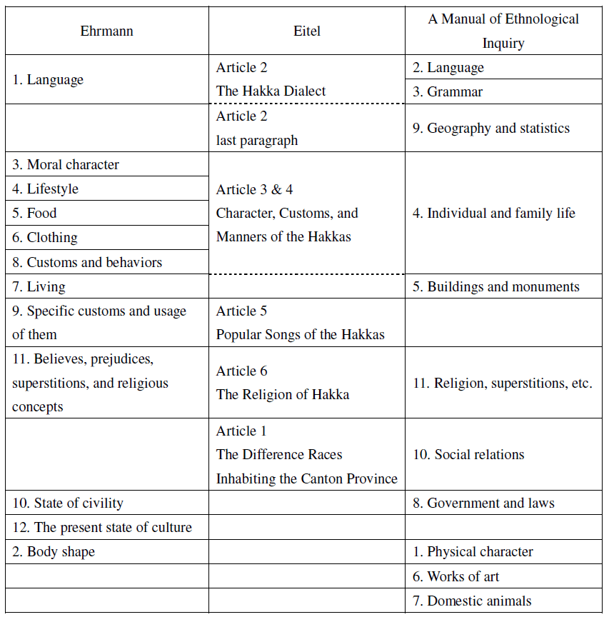 In Figure 1, I compare the topics in Eitel’s “Ethnographical Sketches of the Hakka Chinese” and German and British ethnography. British ethnography is represented by “A Manual of Ethnological Inquiry” (MEI), the questionnaire published by the BAAS in 1852. Since MEI was distributed to missionary stations worldwide, it was possible for Eitel to refer to this questionnaire. MEI suggests eleven topics of ethnographic inquiry: