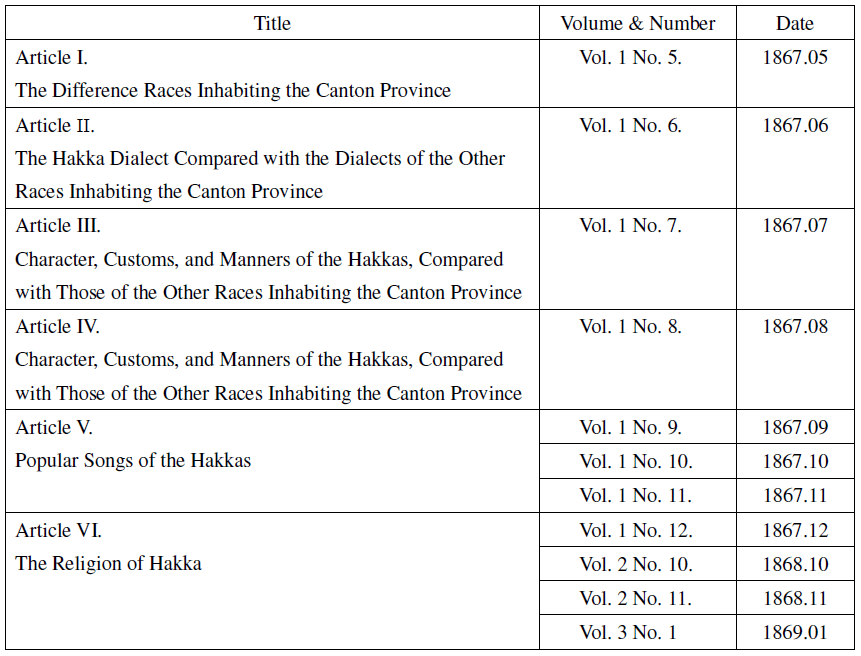 ———. “Ethnographical Sketches of the Hakka Chinese, Article 1-6." Notes and queries: on China and Japan 1.5-3.1 (1867-1869).